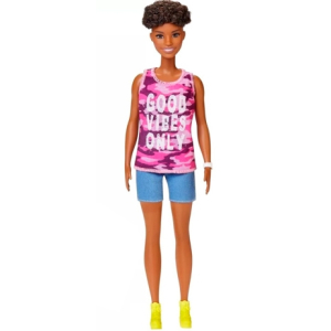 Barbie og hendes venner er forskellige og smukke på hver deres måde. Fashionistas serien hylder forskellighed, ved at lave Barbie i forskellige størrelser og former samt looks. Denne Barbie er i original design med kort og krøllet hår. Hun er iført denim shorts, en pink tanktop samt gule støvler.